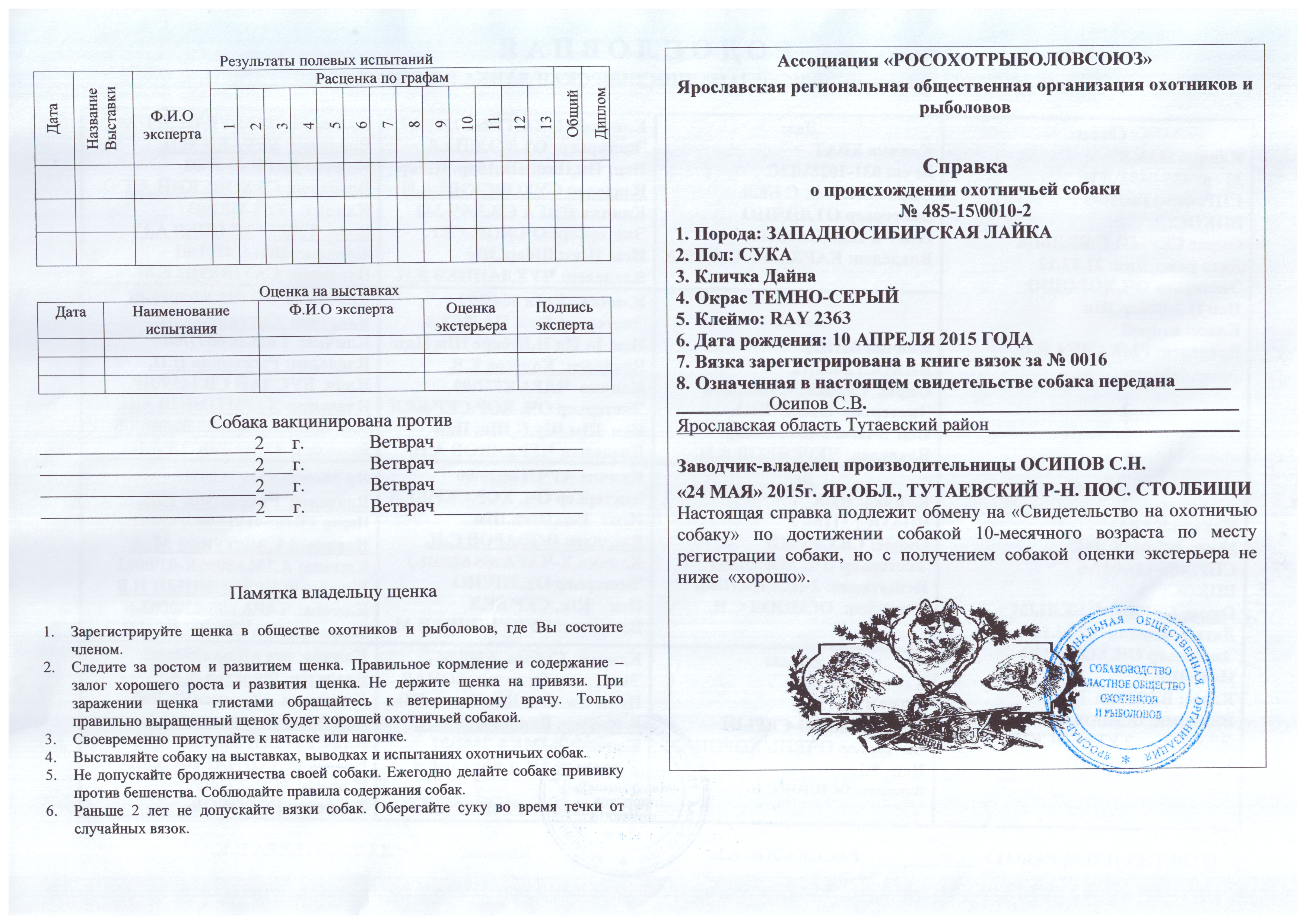 № Свидетельства на охотничью собаку: 833-00/0001-1 № Справки о происхождении: 833-00/0001-1 |