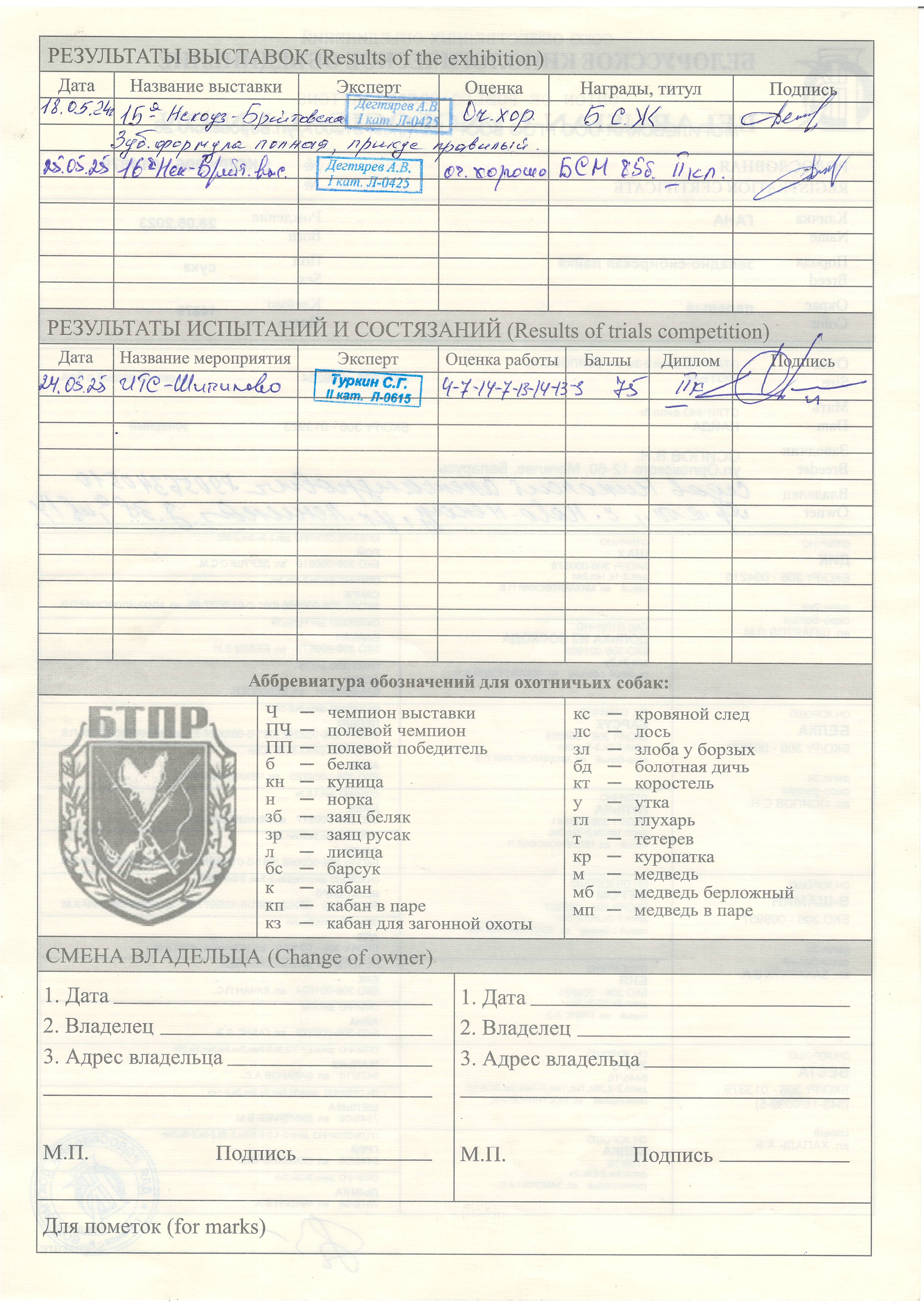Дата Название испытания-состязания 1 2 3 4 5 6 7 8 9 10 11 12 13 Общий балл Диплом Вид дичи Испытание/Состязание Председатель Место проведения Примечания Правило