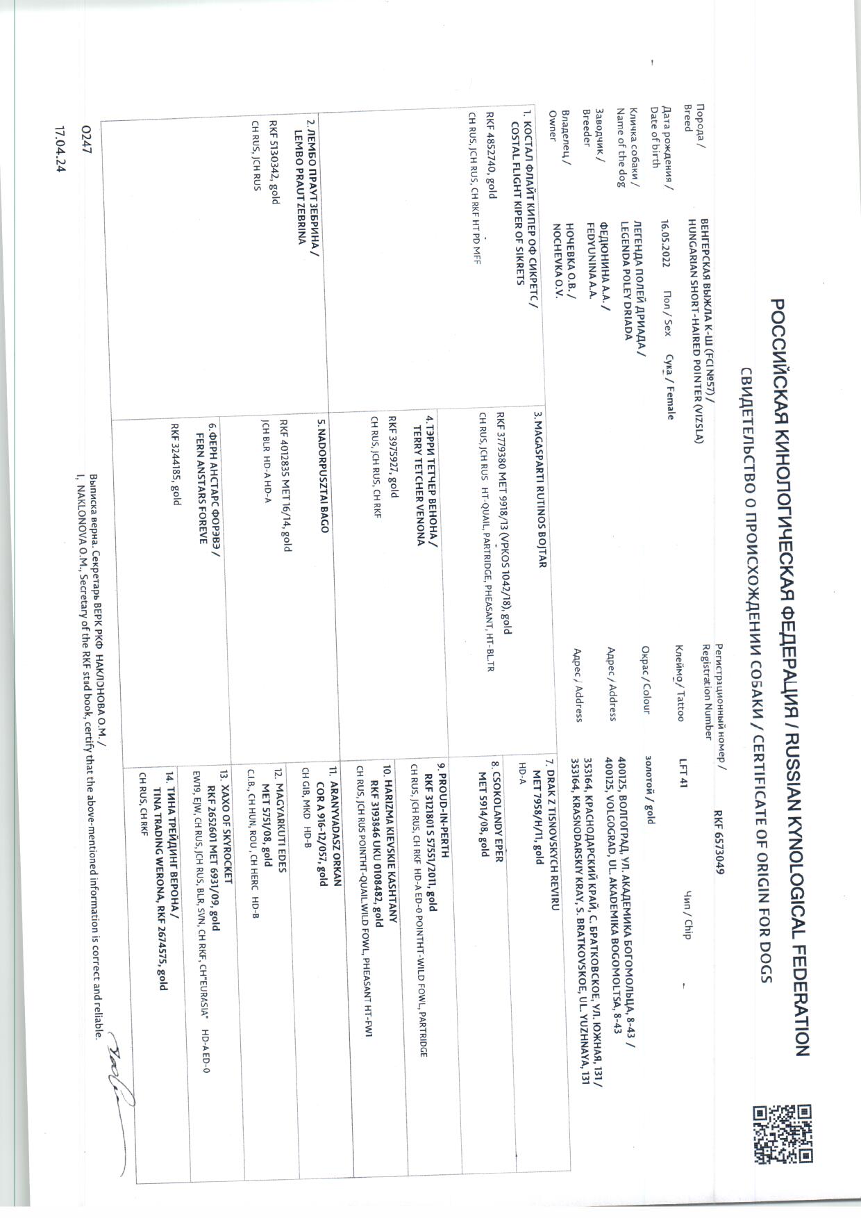 № родословной FCI/РКФ или экспортной: №РКФ 4012835 / Met/mv 16/14 |
