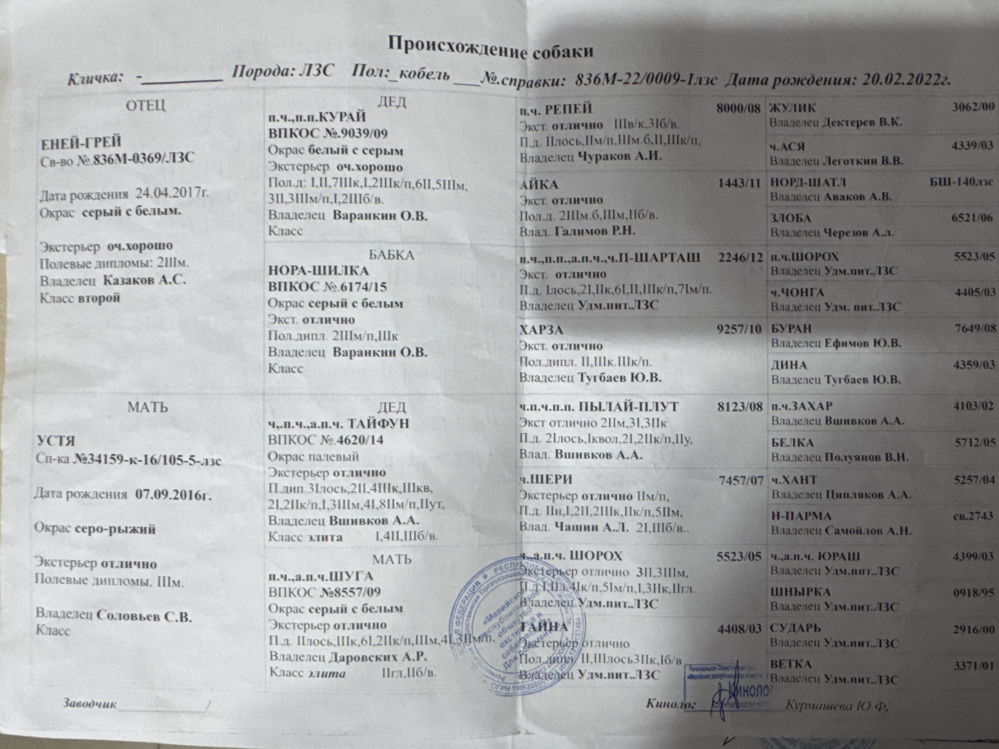 № Свидетельства на охотничью собаку: 836М-389/ЛЗС № Справки о происхождении: 34159-к-17/174-2-лзс Окрас: серый с белым Дата рождения: 24.04.2017 Экстерьер: оч. хор. Дипломы: III м, III м Класс: второй |