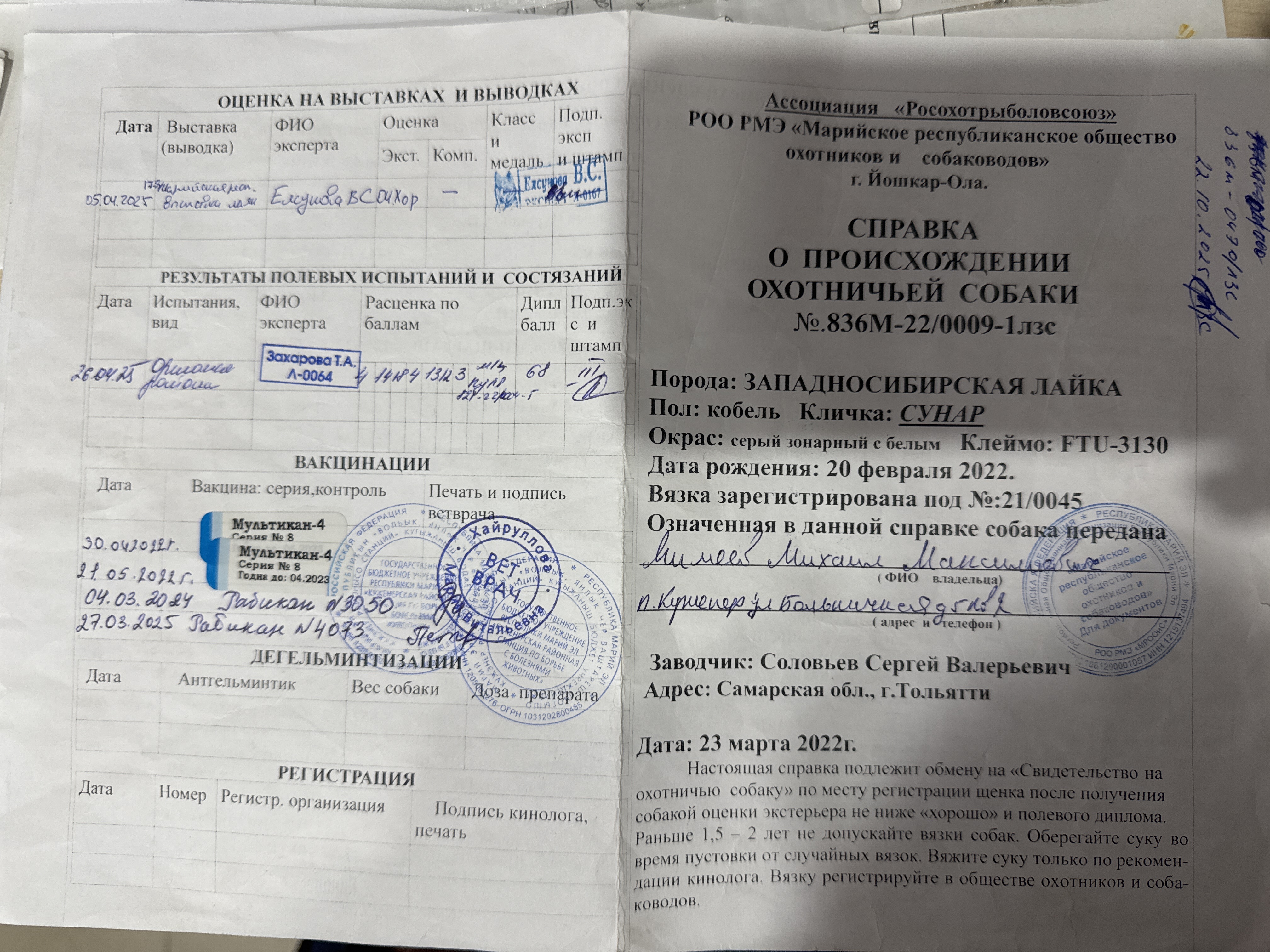 Номер ВПКОС: 4103/03 № Свидетельства на охотничью собаку: 2629 пермь № родословной FCI/РКФ или экспортной: 0008694R |