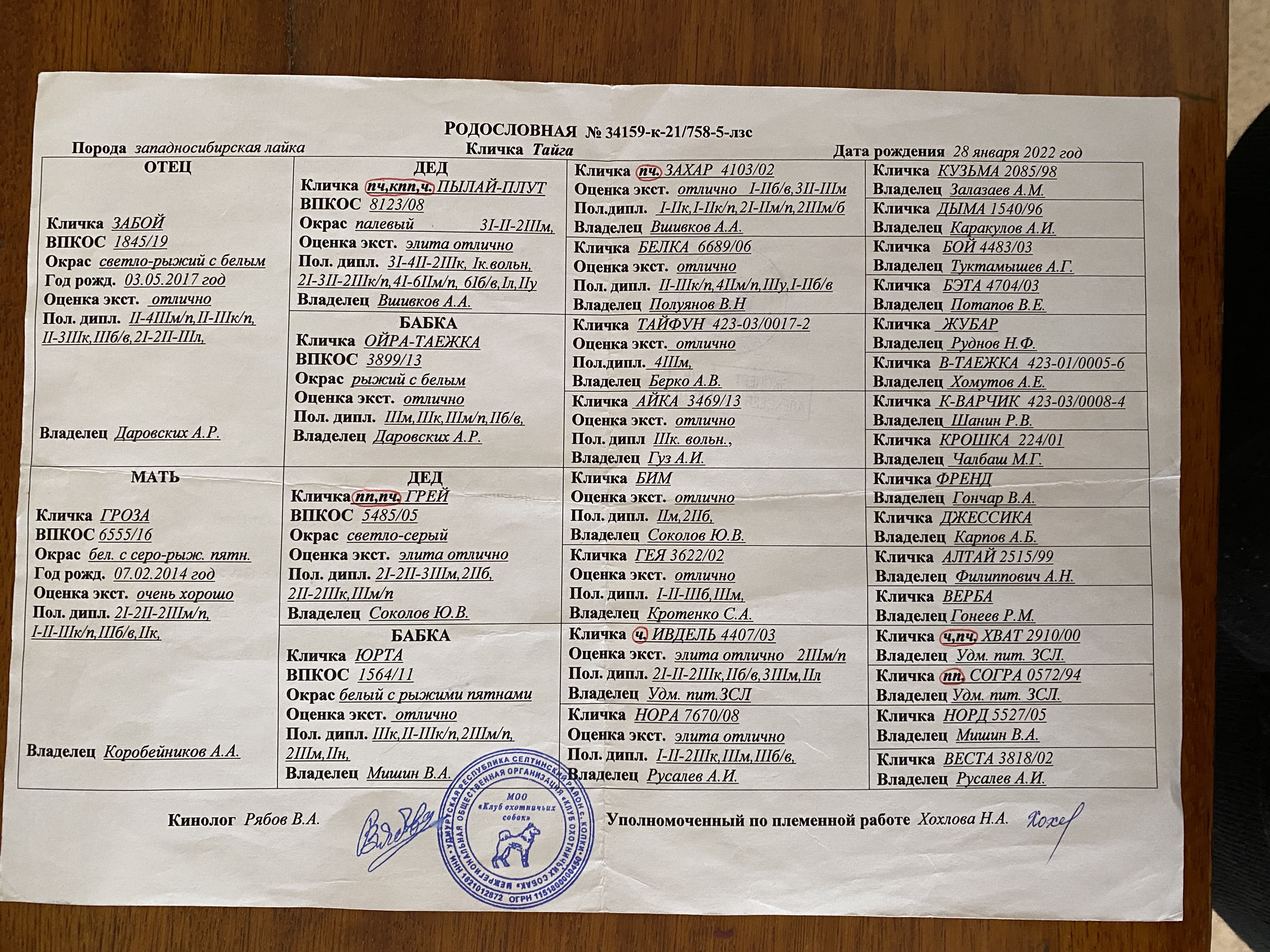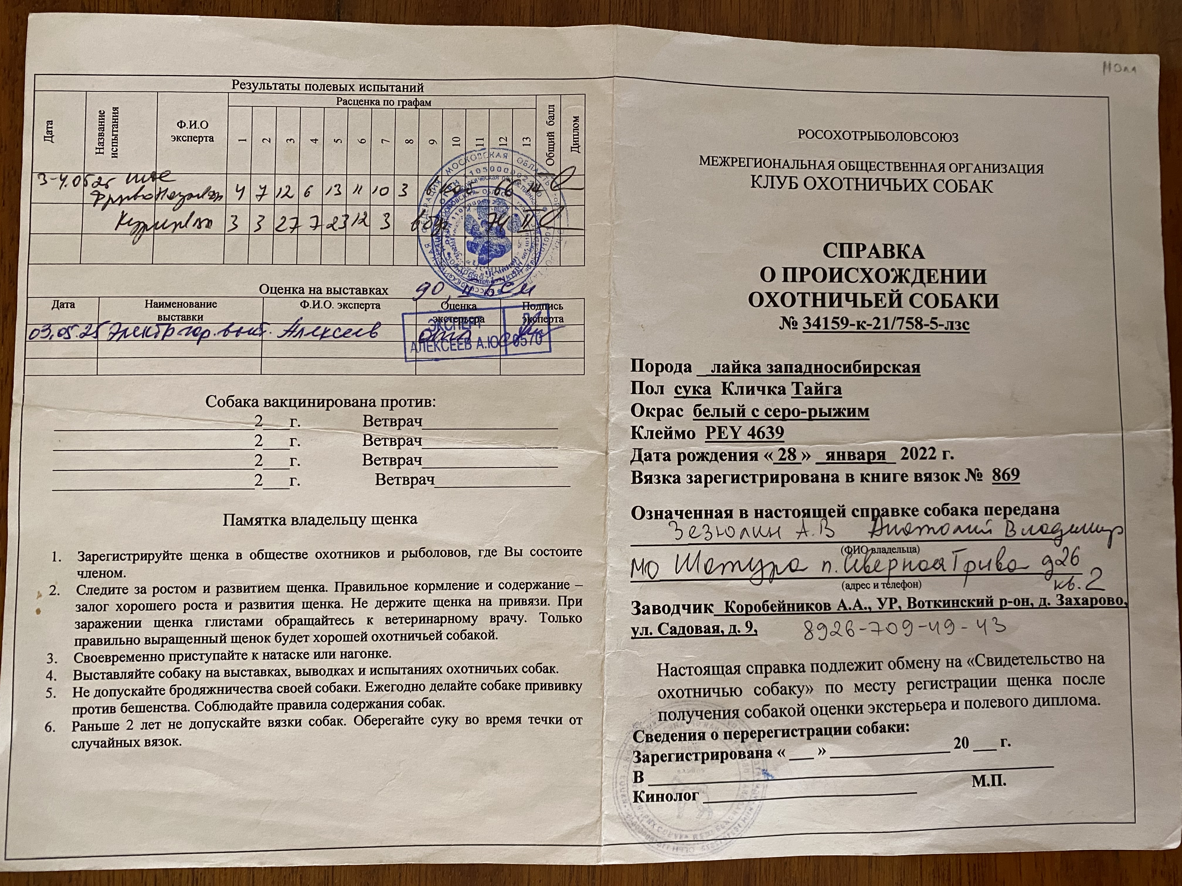 Номер ВПКОС: 4483/03 № Свидетельства на охотничью собаку: 2606 пермь |