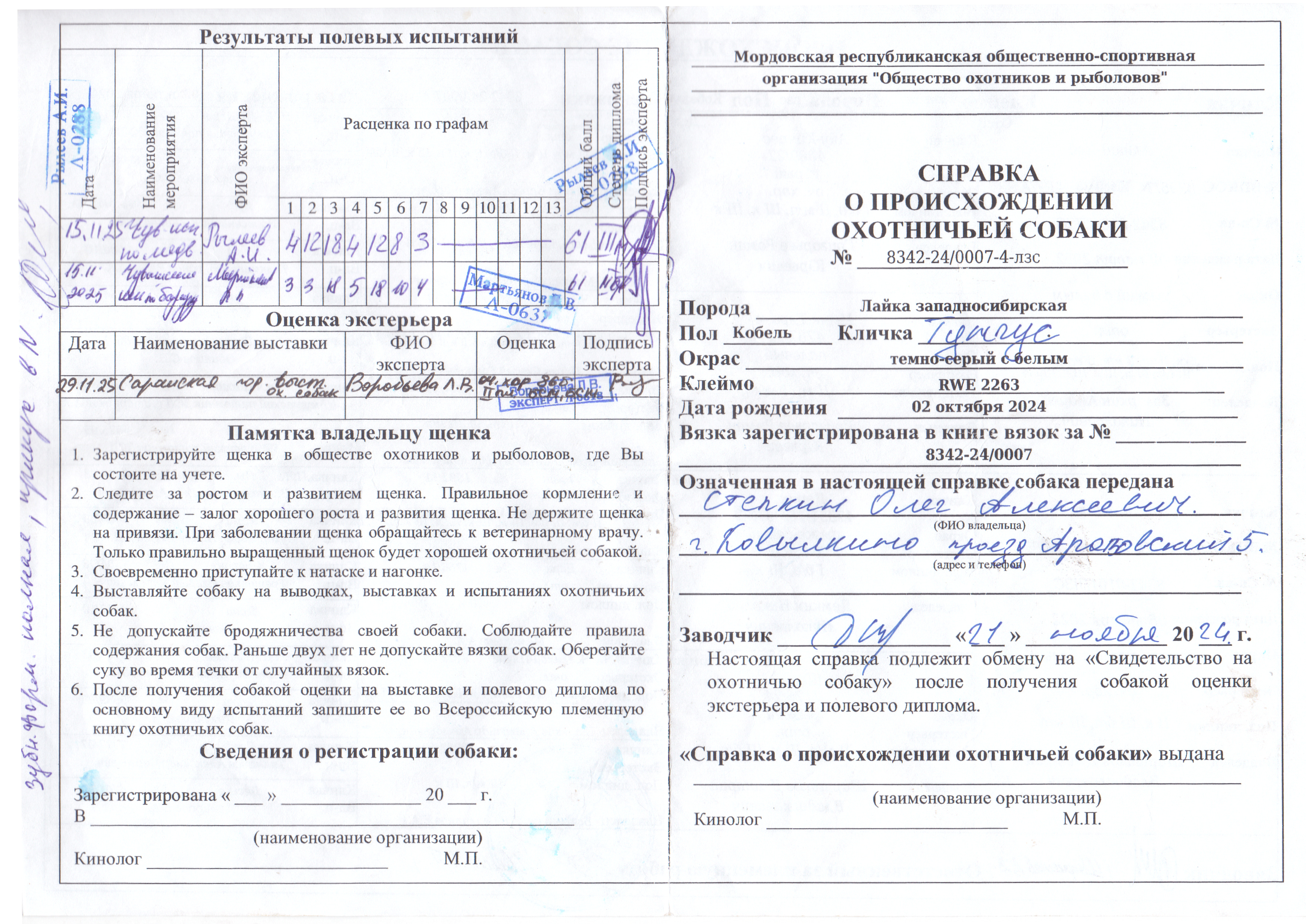 Номер ВПКОС: 7504/08 № Свидетельства на охотничью собаку: 184 клуба лайка |