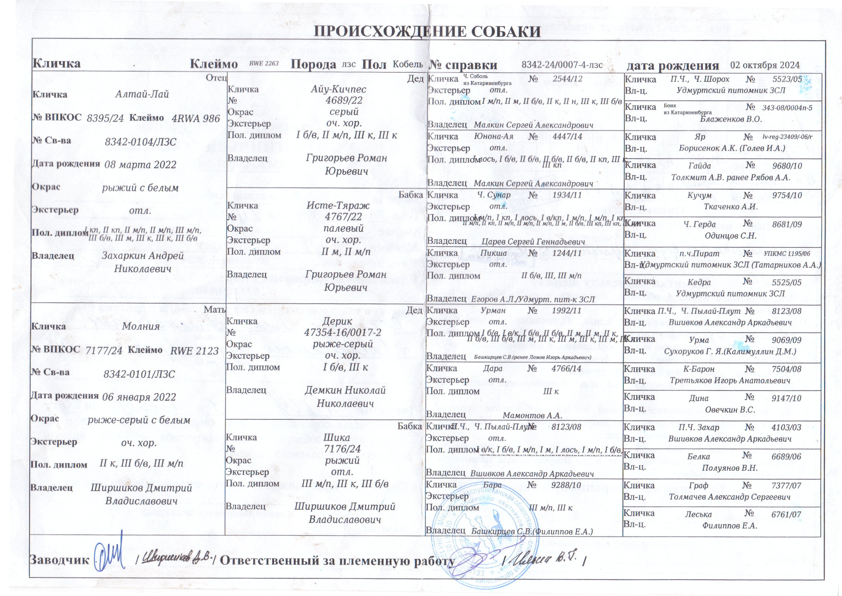Номер ВПКОС: 7177/24 № Свидетельства на охотничью собаку: 8342-0101/ЛЗС № Справки о происхождении: 8342-22/0004-8-лзс Окрас: рыже-серый с белым Дата рождения: 06.01.2022 Экстерьер: оч. хор. Дипломы: II к, III б/в, III м/п Класс: первый |